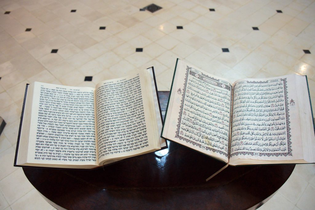 Eine hebräische Bibel neben einem Koran, ein visionäres Bild.