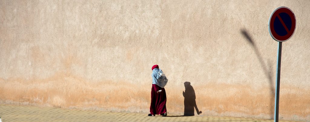 Einsame Frau und Schattenspiele, an der Stadtmauer von Marrakesch. Die Frage nach Ausschnitt und Perspektive stellt sich immer wieder – und die Fragen nach dem Leben: Woher kommt sie? Wohin geht sie? Was macht sie dort?